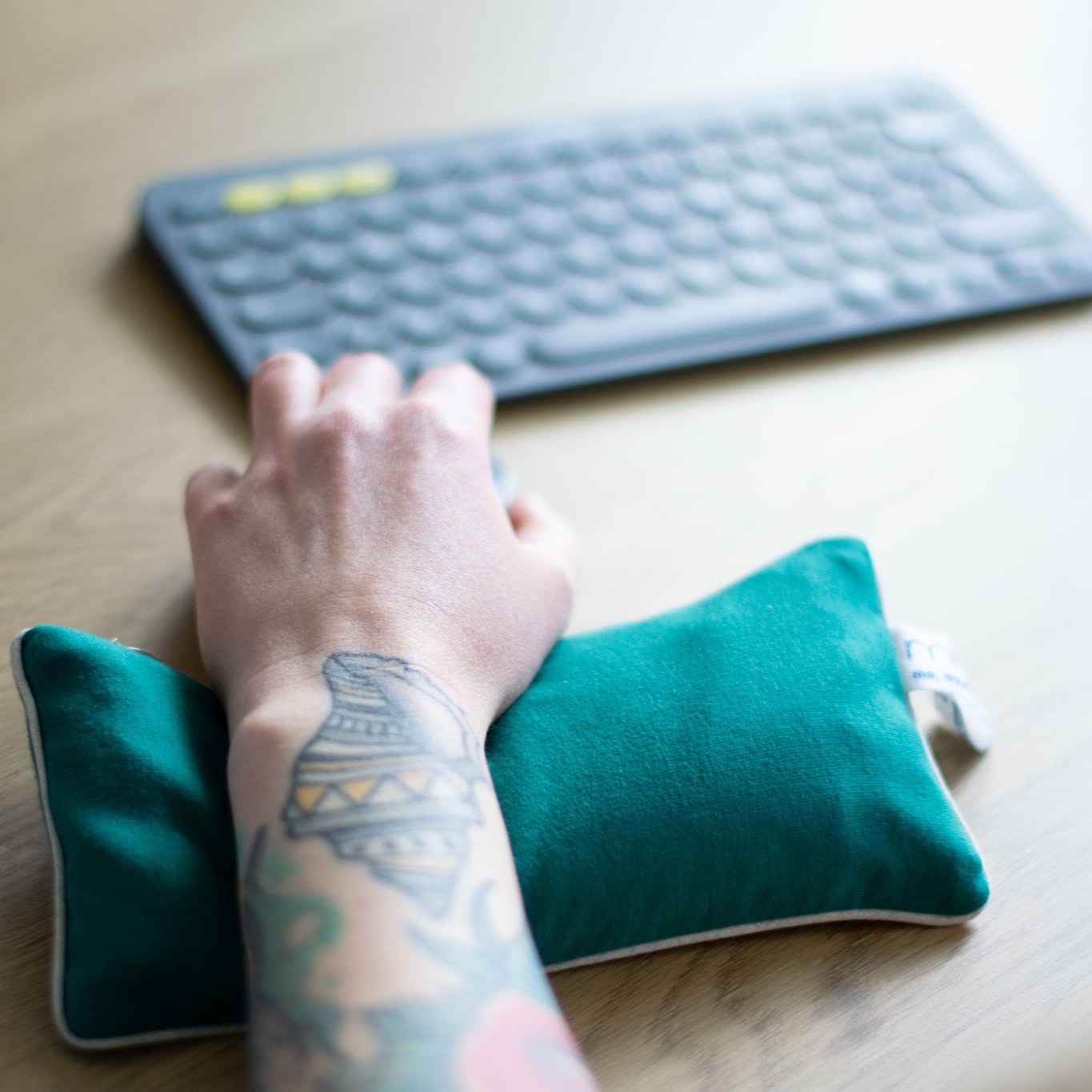 Das MMN Augenkissen kann auch als Handgelenkstütze verwendet werden, um Handgelenksproblemen vorzubeugen. Unter das Handgelenk gelegt, während Sie am Computer arbeiten, hält es es in einer neutralen, geraden Position. Unter dem Unterarm platziert, entlastet es Spannungen, die durch lange Bildschirmarbeit verursacht wurden.